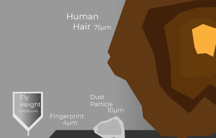 Another incident that often happens when opening a hard disk at home is accidentally touching the platters. Many times it may even go completely unnoticed until taking a closer look and finding a fingerprint or two on the surface of the platter. This can cause issues just as any other form of contamination (check illustration above). It is crucial to wear gloves when working with opened hard drives.